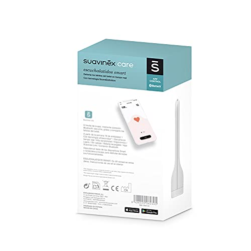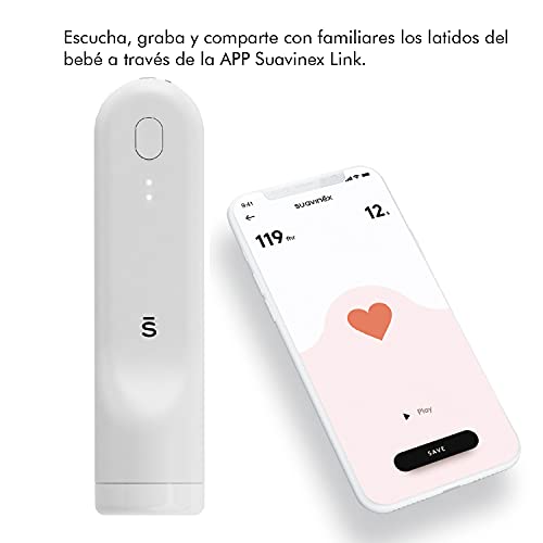 Luister met Smart Suavinex babyslagen met SoundDefinition-technologie. Luisteren, opnemen en delen de hartslagen van de baby via de Suavinex Link-app via de bluetooth-verbinding. Je kunt de hartslag van je baby in alle rust van je huis horen, het geluid opnemen en de opnames naar je dierbaren sturen. Met oplaadbare batterij. Vergeet de batterijen en laad ze op zoals elk ander apparaat. Draadloos alles in één apparaat dat draadloos met je mobiele telefoon is verbonden. Hoe werkt het? 1. Schakel het luisterplezier in door een paar seconden op de ON/OFF-knop te drukken en als het Bluetooth-licht knippert, is het apparaat klaar voor verbinding met de Suavinex Link App 2. Schakel de bluetooth van je mobiele apparaat in. 3. Open de Suavinex Link app en bekijk de apparaten wegen. Selecteer het luisteren en volg de instructies in de app. Schakel het apparaat uit voor het reinigen en/of onderhoud. Reinig het contactpunt met een 70% alcoholoplossing of isopropylalcohol. Je kunt ook een licht vochtige doek met water en zeep gebruiken. Aan de lucht laten drogen of goed drogen met een zachte doek. Technische gegevens: gevoeligheid: meer dan 90 dB, meetbereik: 50 tot 210 slagen per minuut, nauwkeurigheid: ± 2 slagen per minuut, bedrijfsmodus: continu dubbeler, waterdichtheid: IP22, geluidsfrequentie: 2,5 MHz ± 15%, ultrasoon vermogen: tot 20 mW, effectief emissiebereik: 245 mm2 ± 15%, P: